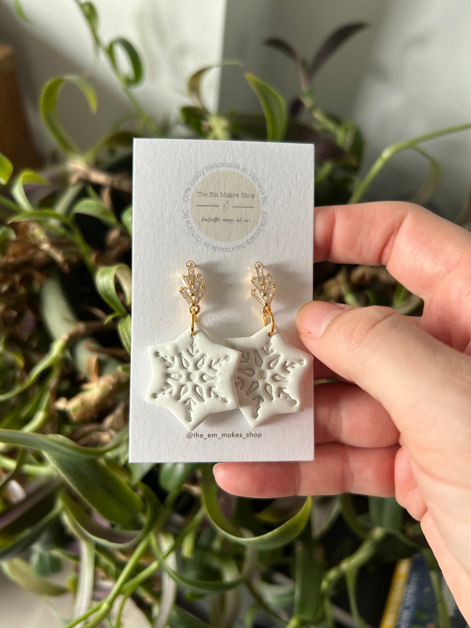 Who doesn’t love a bit of sparkle with their snowflakes? These are a cubic zirconia stud with the white clay snowflake. The gold plated stainless steel and the polymer clay make these light weight and easy for every winter occasion!
